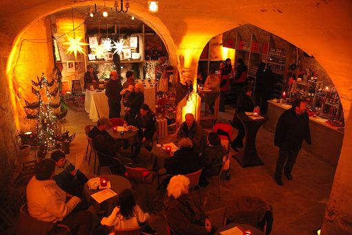 Kein Wunder, dass man daher unter dem Neubau einen geräumigen Weinkeller anlegte. Man steigt am östlichen Eingang siebzehn steile Stufen hinab in ein hohes Kreuzgratgewölbe, das von zwei mächtigen quadratischen Säulen getragen wird. Seitlich schließt sich ein Tonnengewölbe an, von dem es, - wie bei anderen Kellern in der Doppelstadt auch – einen Verbindungsgang gibt zum Gewölbe-Ensemble, das heute zum Bereich der Keller der Zunftweinscheune gehört. Dieser Rathaus-Keller wurde bis nach dem zweiten Weltkrieg von der Firma Westermann & Werner bewirtschaftet.