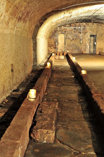 Despite a reduction in its size necessitated by the building of Bismarckstraße, the small entry cellar still boasts an appealing triple vault supported by massive pillars. Behind this, however, may be found two long barrel vaults running parallel to each other which extend beneath the house and right out into the garden on the hill side of the property. Where a section of the right-hand end wall was sectioned off to make a small bottle store, the left side features a Romantic well chamber where fresh clear water constantly drips into a large basin.