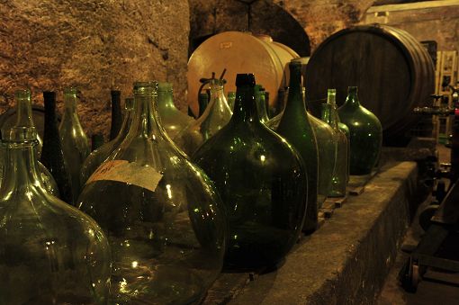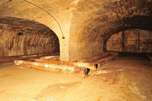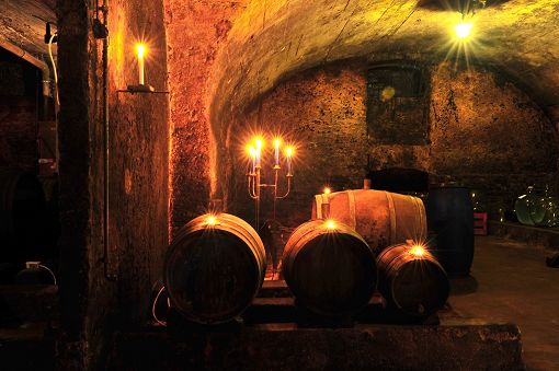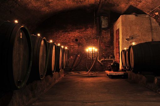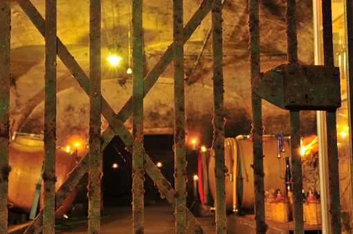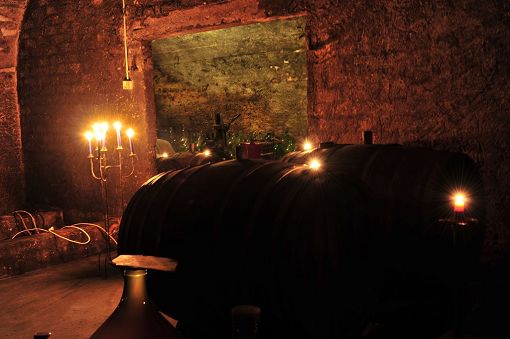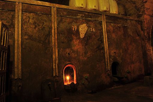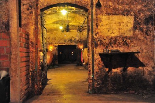 The cellars are arranged around the large courtyard and the adjacent production premises. Beneath the latter are four parallel barrel vaults. One of them features three concrete tanks installed on the hill side in 1956 to increase storage capacity. Opposite these tanks a staircase leads down into a lower cellar to the side, with two additional barrel vaults beneath the yard running parallel to Schottstraße. Access to an older cellar was blocked when the street was widened.
